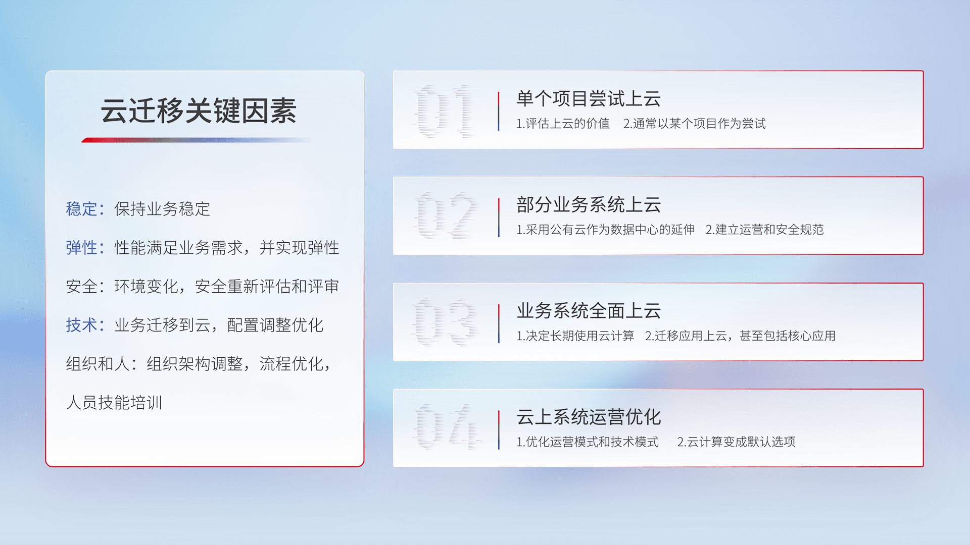 结合实际业务,,,从规划设计、、云平台选型、、、、云原生改造、、数据迁移、、集成交付,,迁移全过程为客户识别最佳上云路径,,,做好风险识别管理,,,,设计网络架构、、、、身份权限、、、安全审计合规、、、操作审计、、、日志审计、、、监控告警策略、、多站点容灾设计等,,对云上基础设施进行整体规划,,,提升IT治理水平,,,,以满足弹性、、、、高可用、、高性能的需求。。。。
